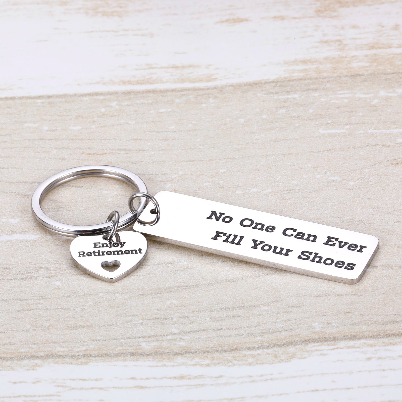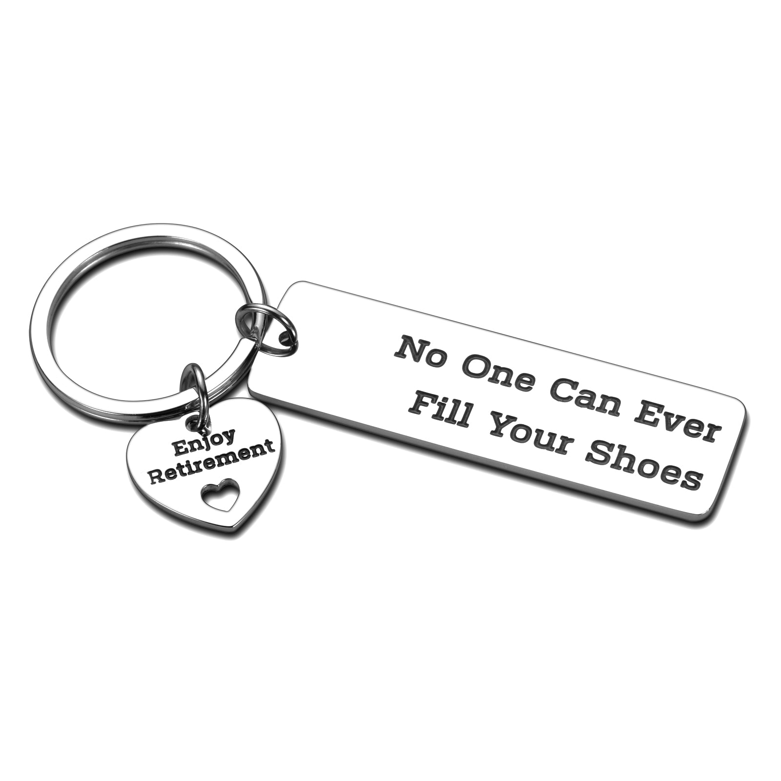 - The retirement keychain is engraved with "No one can ever fill your shoes" and "Enjoy retirement". It would be a great gift for retiree to celebrate this wonderful new chapter in their lives. Thank you for all that you have done and that you will always be missed.
