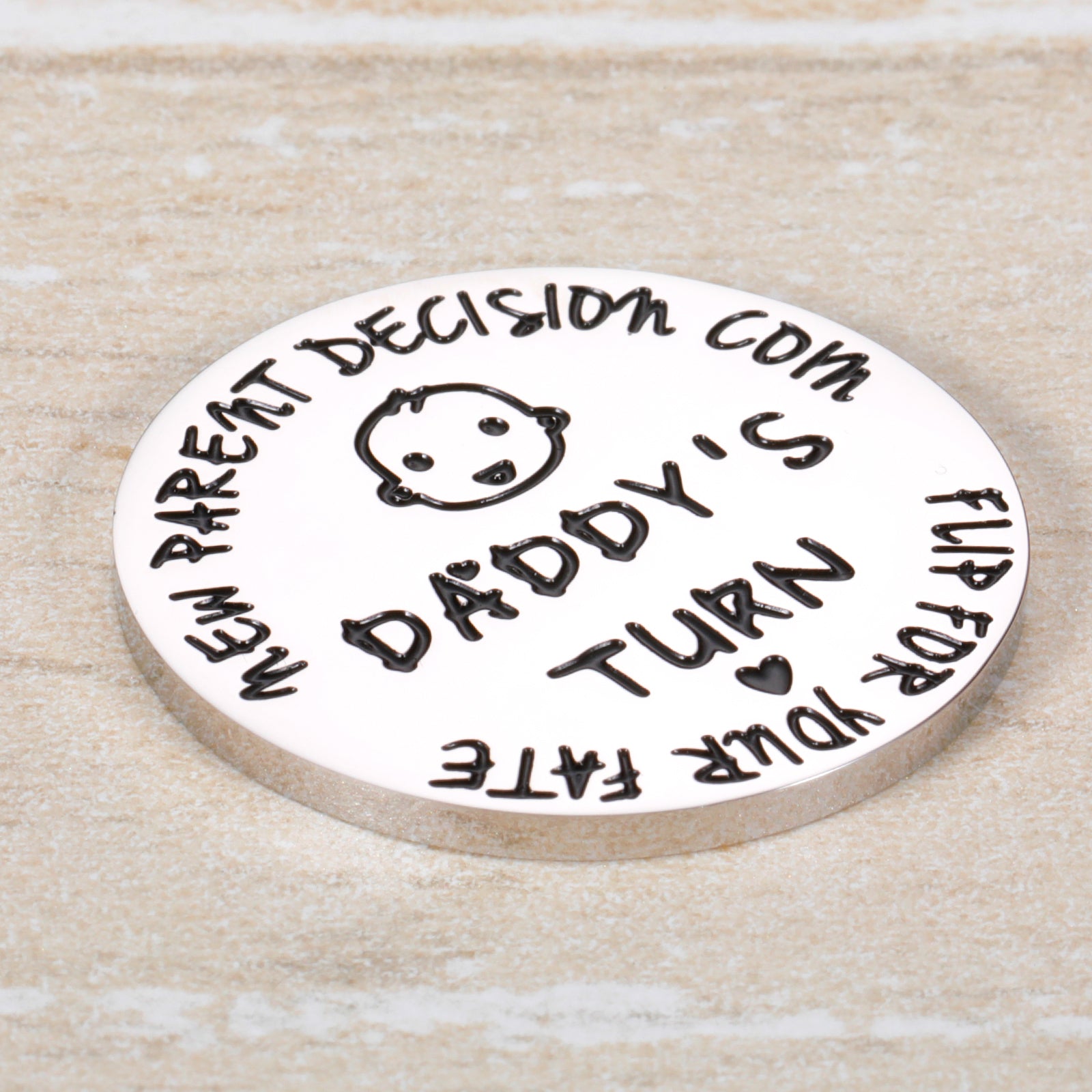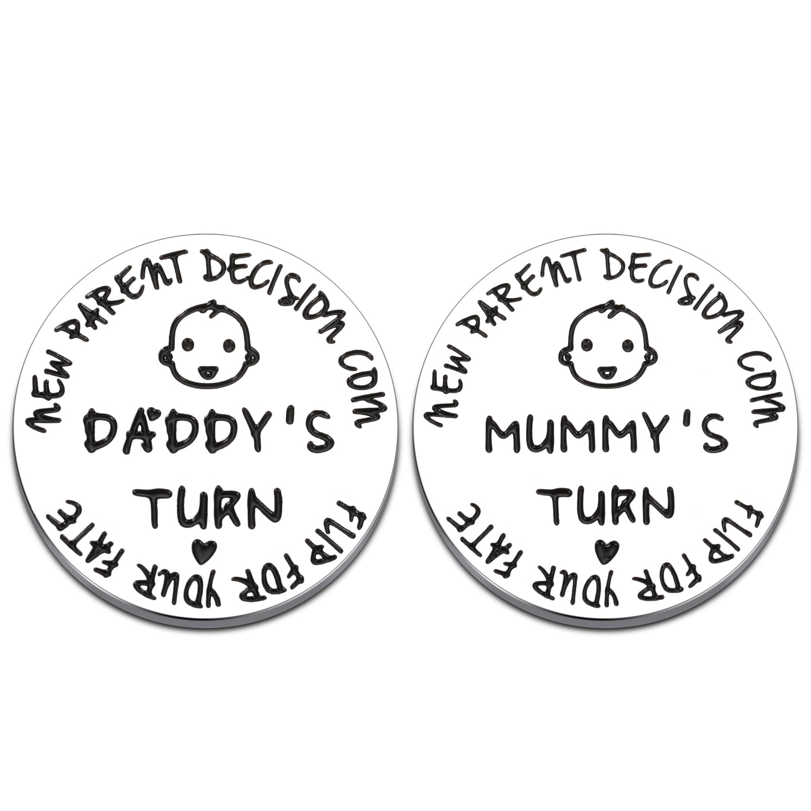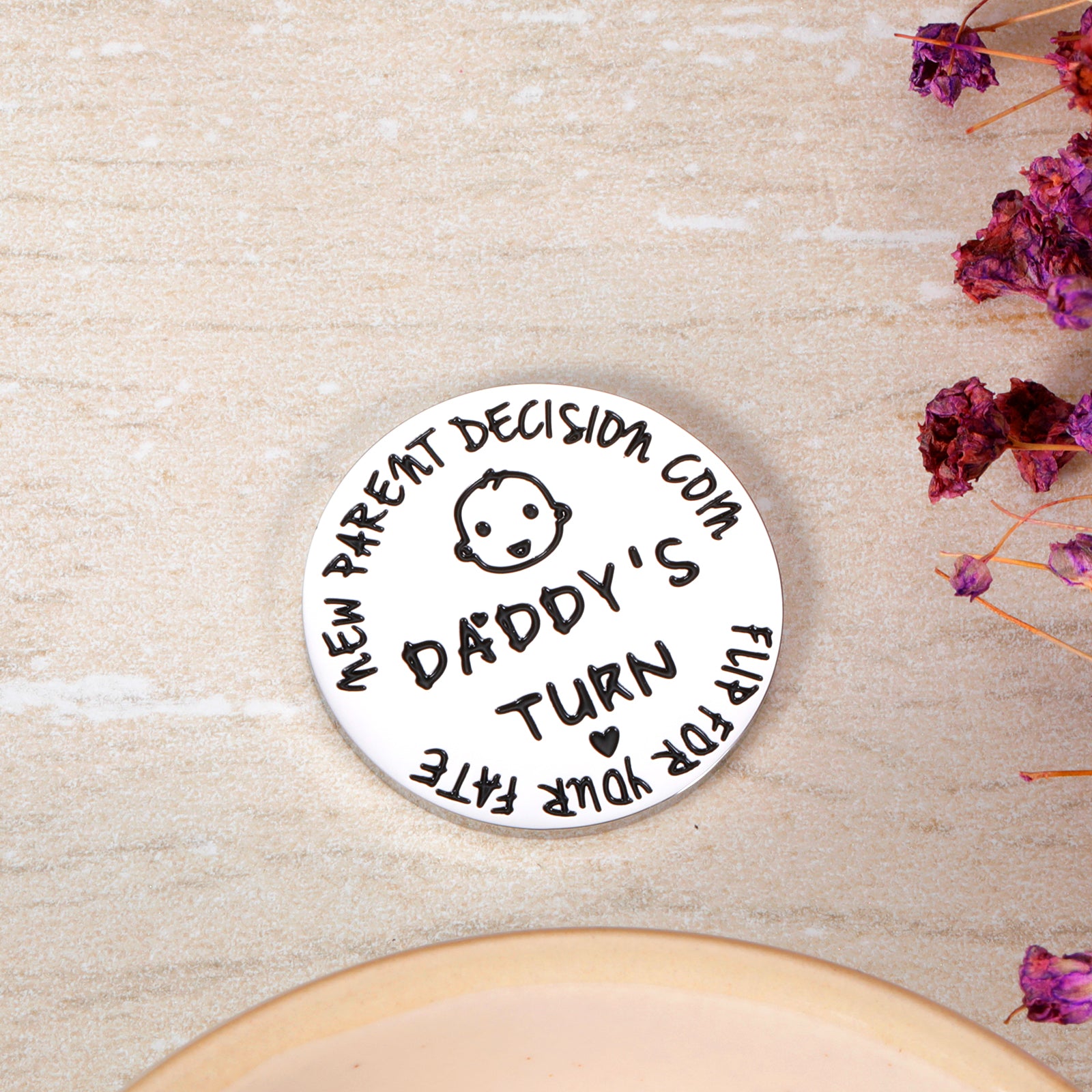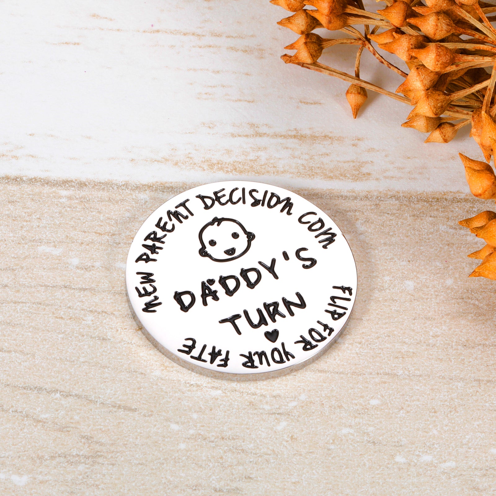 - Interesting Double-Sided Design:Our double-Sided decision coin is engraved with Daddy's Turn on one side,the other side is engraved with Mummy's Turn.Perfect gift for new parents to help them decide who's turn it is to change the next dirty nappy, the night time feeds, Bath time, bed time and when baby wakes at night.