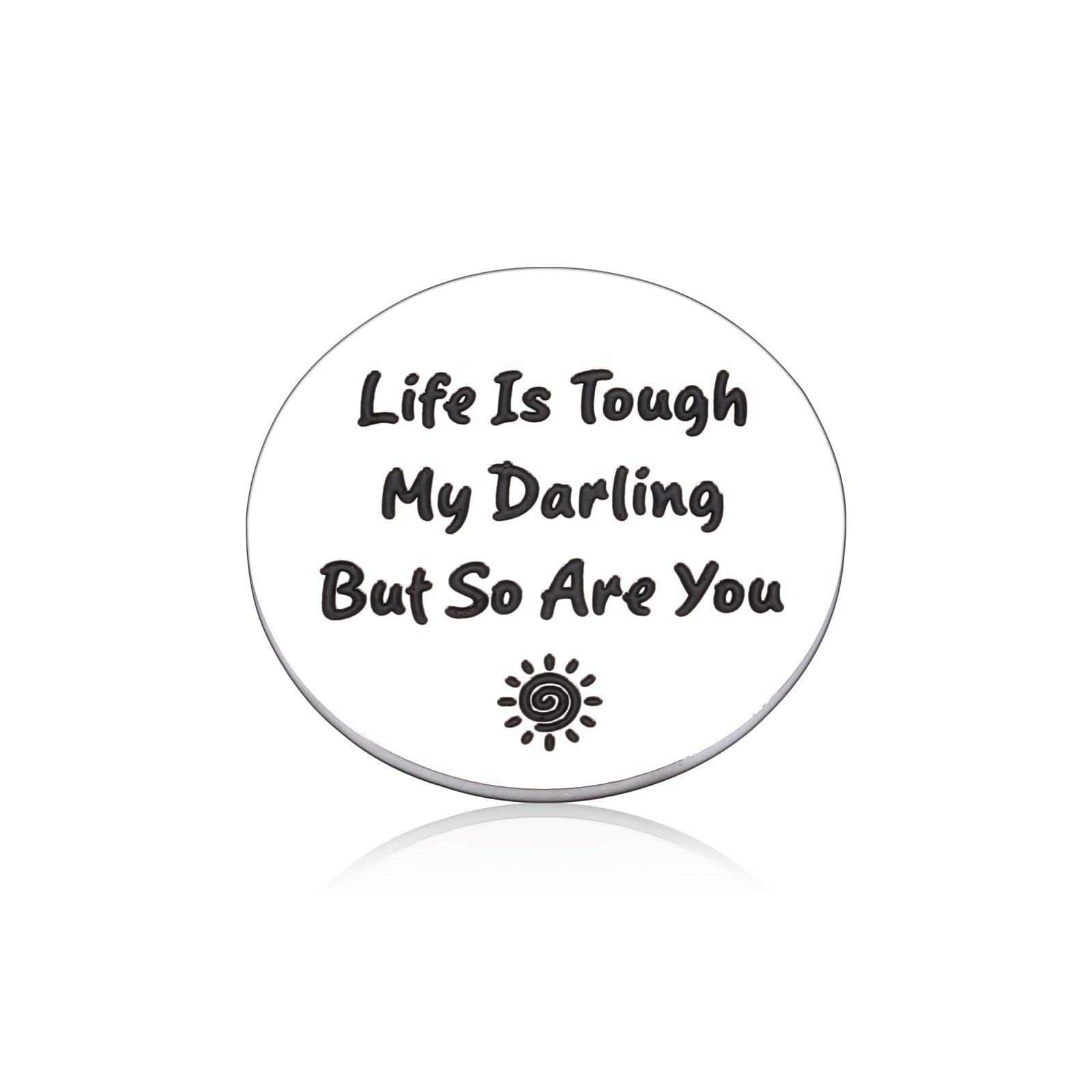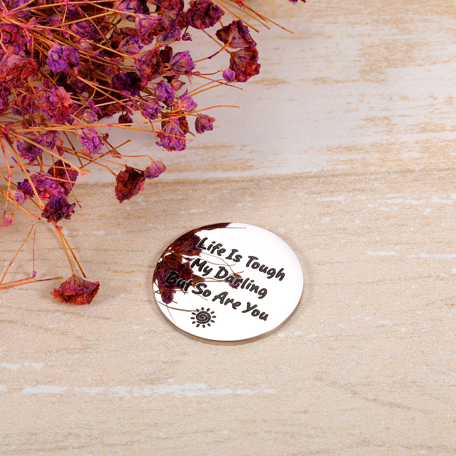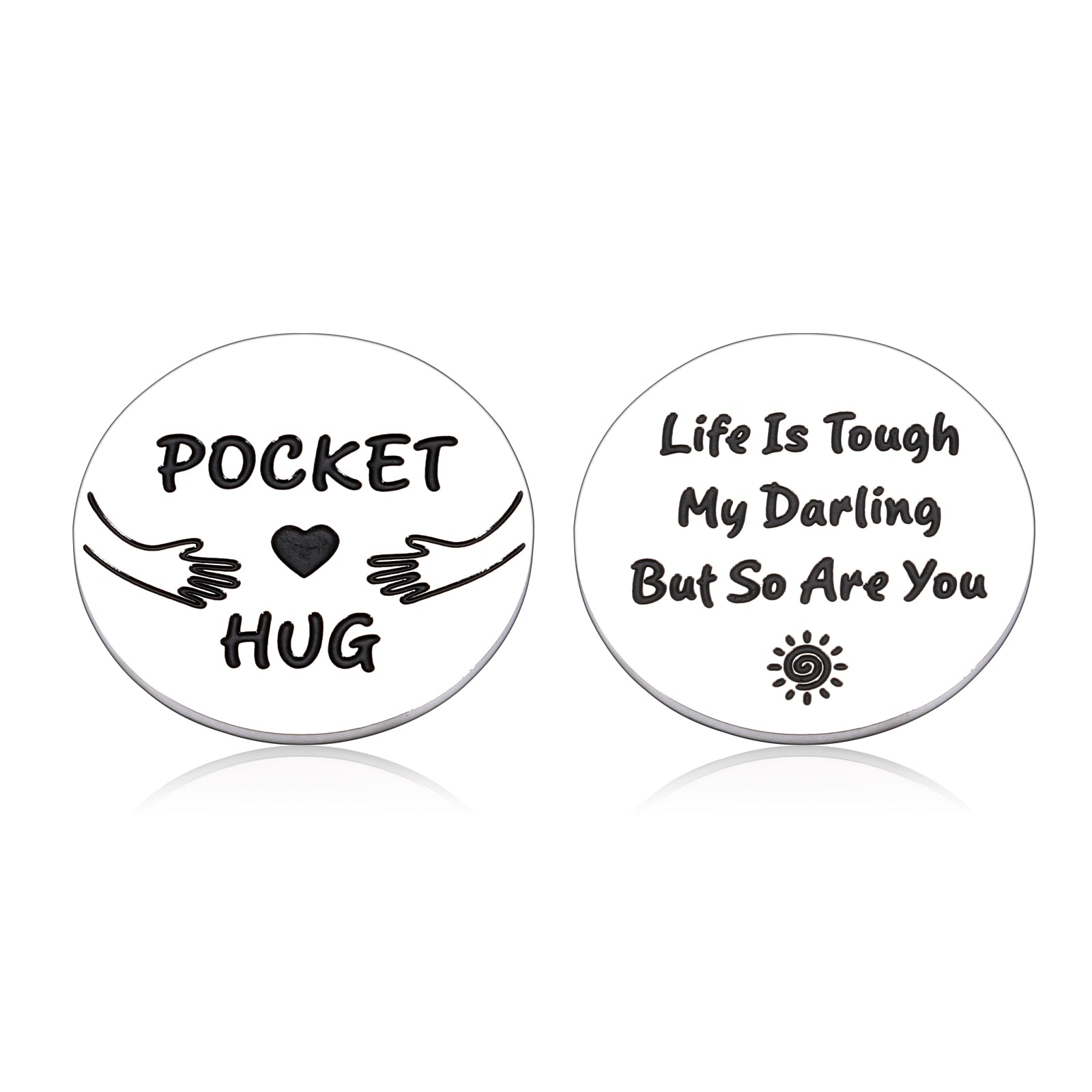 Positive Long Distance Relationship Gifts- The double-sided token's front engraved with "Life is tough, my darling, but so are you" and its back engraved with "pocket hug". When back to school, birthday, christmas, valentine's day, mother's day, father's day, graduation, thanksgiving, engagement, deployment, new year, boss day, easter, or halloween, but you can't be there with your BFF, BF, girlfriend, son, daughter, husband, and wife, then just show you care with a little pocket hug token.
