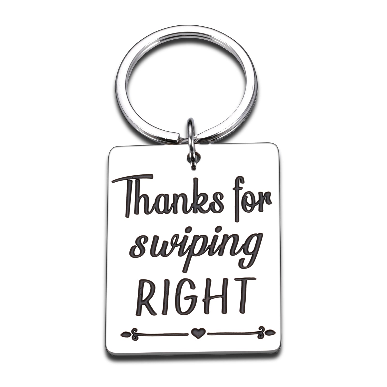 | Funny Valentines Gifts for Him Her- 'Thanks for swiping right'. As the words engraved on the keychain, this is the memory of a couple who have been dating online, such as Facebook, Twitter, Instagram, Facetime, SMS, Tinder, Bumble, eHarmony, or any other social website or online dating website. So the keychain must be perfect gifts for couples who met online. Great little gifts that have so much meaning to boyfriend, girlfriend, boys girls, men, women, fiance, fiancee, bride, groom, or husband. |